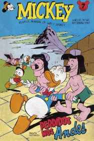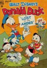 verfilmt wurde - "Lost in the Andes [Verirrt in den Anden]" in Italien schon 1949 als "Das Geheimnis der Inka" (und in Brasilien, wo die Mickey-Mouse-Hefte 1952 eingeführt werden, immerhin 1957), in der BRD dagegen erst 1963 (in 5 Fortsetzungen, ohne ein einziges Mal auf dem Cover zu erscheinen) als "Im Land der viereckigen Eier", noch dazu gekürzt um die vom Zensor als "gewaltverherrlichend" eingestufte Schlußsequenz, in der Donald - der keine Eier mehr sehen kann - ein Restaurant verwüstet, nachdem man ihm dort eine Speisekarte mit lauter Eierspeisen vorgelesen hat.