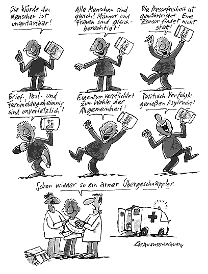 55 Jahre, nachdem Ernst von Salomon seinen Bestseller Der Fragebogen heraus gebracht hatte, fühlte sich auch die Hessische Landesregierung bemüßigt, einen "Fragebogen" zu veröffentlichen. Der Unterschied war allerdings, daß den ersteren Ausländer - von bösen Zungen auch "Besatzer" genannt, später zu "Befreiern" befördert - verfaßten, um Deutsche auszubürgern bzw. ihnen ihre Freiheit und/oder ihre politischen Rechte zu nehmen; den letzteren verfaßten dagegen besonders gute Deutsche - einer von ihnen wird uns in einer Antwort auf die 97. Frage wieder begegnen -, um Ausländer nicht einbürgern zu müssen. Da dieser zweite Fragebogen inzwischen so bekannt ist, daß er sich selbst bis zu unseren englischen Freunden und Verbündeten herum gesprochen hat und diese ihn zum Anlaß genommen haben, einige (nicht ganz ernst gemeinte? Der britische Humor ist ja berühmt-berüchtigt!) Antworten nebst Illustrationen zu veröffentlichen, will Dikigoros nicht zurück stehen, auch um besagte Freunde ein wenig zu korrigieren. Allerdings stammen die folgenden Antworten bis auf wenige Ausnahmen nicht von Dikigoros persönlich - die meisten hat er lediglich kommentiert (sofern sich eine Kommentierung nicht erübrigte :-) Die Antworten haben er und seine Frau gesammelt in ihrem Bekannten- und Verwandtenkreis aus braven und weniger braven Deutschen, EU- und Nicht-EU-Ausländern, eingebürgerten und noch nicht eingebürgerten - und solchen, die sich gar nicht einbürgen lassen wollen. Alle Altersgruppen sind vertreten, von 13 bis 89, Männlein und Weiblein vieler verschiedener Bildungs- und Berufsgruppen - bei den originellsten Antworten hat sie Dikigoros mit angegeben; er hofft, daß er diese Untersuchung zum Einbürgerungstest im Laufe der Zeit noch ausweiten kann.