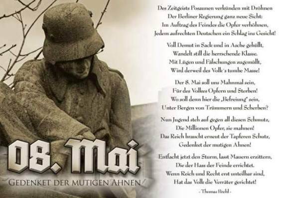 [...] Mit meinem heutigen Bericht habe ich versucht, einen Beitrag zu leisten zur Aufklärung und Wahrheitsfindung über unsere Geschichte, besonders die um den 08. Mai 1945. Bisher haben wir doch offiziell nur erfahren, was wir, die "bösen Deutschen" und "die Nazis", für Verbrechen verübt [... (Zensur - KHH.)] wurde sogar unter Strafe gestellt. Ich habe viele Quellen untersucht und wollte Ihnen viel Neues und Interessantes bieten, was sich um den 08. Mai 1945 ereignet hat. Ich selbst war erschüttert über das Ausmaß der Ungeheuerlichkeiten (das Schlimmste habe ich wegzensiert, wegen des freiheitlichsten Staat auf deutschem Boden - KHH.), die unserem Volk angetan wurden. Ich hoffe, daß ich Sie nicht zu sehr belastet habe, doch es war die Wahrheit und Realität. Abgeschlossen am 27. April 2008.