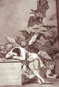 Kurzum, der Aufstand der "Nationalen" war, nachdem er in den ersten drei Tagen keinen durchschlagenden Erfolg hatte, so gut wie chancenlos, denn er konnte sich nur auf die ärmsten Gebiete mit den wenigsten Ressourcen stützen: Alt-Kastilien mit León und Galizien (dorther kam wie gesagt Franco), Nordwest-Aragon, genauer gesagt Navarra (dorther kamen die ursprünglichen Anführer des Aufstands, die Generäle Sanjurjo und Mola) und West-Andalusien; dazu kam bald die - noch ärmere - Estremadura. Damit war kein Staat zu machen. Die Republik hatte dagegen neben Katalonien und dem Baskenland Asturien, Neu-Kastilien, Ost-Aragon und Murcia, also alle Gebiete mit nennenswerten Bodenschätzen und Industrien, u.a. sämtliche Rüstungsbetriebe. Was machten die "Republikaner" aus diesem Vorteil? Nun, im Gefühl des sicheren Sieges feierten sie erstmal eine schöne lange Orgie aus Plünderung, Brandstiftung, Mord und Vergewaltigung, d.h. sie "enteigeneten" die Kapitalisten - vor allem deren Autos -, und zerstörten den Rest, mit dem sie nichts anzufangen wußten, z.B. die noch nicht durch Streiks ruinierten Betriebe; die Fabrikanten, die nicht rechtzeitig flohen, waren des Todes. Nun mag es ja nicht weiter schlimm sein, Priester, Rechtsanwälte, Notare und "Ausbeuter" zu beseitigen; aber welchen Sinn macht es, auch Architekten und Ärzte zu ermorden? Gironella läßt es einen Roten ganz cynisch formulieren: Erstens sind die Ärzte eh alle Quacksalber, und zweitens ist es viel besser, einen toten Martyrer zu haben, als jemanden, den die Ärzte retten, der seine Rettung dann aber womöglich dem lieben Jesulein zuschreibt. Na schön, aber die Landwirtschaft? Den Pächtern wird gesagt, sie bräuchten künftig nichts mehr an ihre Grundherren abzuliefern, sondern sollten es getrost den roten Milizen zur Verfügung stellen. Das tun sie anfangs gerne, denn es kostet sie ja nichts; aber dann sollen sie mehr abliefern, als sonst ihr Pachtzins betrug, am Ende gar alles. (Selbstverständlich wohnen die roten Bonzen auch umsonst in den besten Hotels, die kurzerhand beschlagnahmt werden, essen umsonst in den besten Restaurants und fahren umsonst 1. Klasse mit der Eisenbahn.) Und als sie das nicht mehr so gerne tun, wird es ihnen mit Gewalt abgenommen, wer protestiert, wird tot geschlagen. Folge ist, daß im nächsten Frühjahr niemand mehr bereit ist, auszusäen und im roten Gebiet eine Hungersnot ausbricht. Aber so weit sind wir ja noch nicht, sondern in den ersten drei Wochen, welche die Roten ungenutzt verstreichen lassen. Die "Nationalen" können also nach der Eroberung der Estremadura umgruppieren und gen Osten marschieren. Der Weg ist frei, Madrid im August 1936 praktisch noch unverteidigt. Franco bräuchte es nur zu besetzen, die roten Banditen hops zu nehmen und eine neue Regierung zu bilden, und für die Säuberungen im Rest Kastiliens hätte er vielleicht noch ein paar Wochen, schlimmstenfalls Monate benötigt. Es hätte keine ausländische Intervention gegeben, kein Jahre langes Abschlachten von Mensch und Vieh. (Ja, wußtet Ihr das nicht? Im Spanischen Bürgerkrieg wurden - inclusive Vor- und Nachspiel - nicht nur über eine Million Menschen getötet und über zwei Millionen zu Krüppeln gemacht, sondern auch ein Drittel des spanischen Viehbestands wurde getötet, nicht etwa um den Hunger zu stillen - der kam dann später als Konsequenz davon -, sondern aus purer Mordlust!) Was tut Franco statt dessen? Er marschiert auf Toledo und Oviedo - wo gute Kumpel von ihm belagert werden. Es gelingt ihm auch tatsächlich, sie heraus zu hauen - ein schöner Propaganda-Erfolg, mehr aber nicht; und die Zeit, die das gekostet hat, ist nicht wieder einzuholen: Als Franco am 7. November 1936 endlich vor Madrid steht, ist es zu spät: Die Roten haben kräftig aufgerüstet; am 8. November rücken die "Internationalen Brigaden" in Madrid ein. Gegen fast zehnfache Übermacht zwar kaum ausgebildeter, aber engagiert kämpfender Brigadisten holen sich Francos Truppen blutige Nasen. Es ist kein Durchkommen ("no pasarán [sie werden nicht durchkommen]" wird zum Schlachtruf der roten Propaganda); die Fronten fahren sich fest, mit einer schnellen Entscheidung und Beendigung des Bürgerkrieges ist nicht mehr zu rechnen. Ein Alptraum beginnt; und Gironella läßt eine seiner Figuren den Spruch zitieren: "Der Schlaf des Verstandes gebiert Monster" - und damit sind wir wieder bei Goya, der eines seiner Bilder aus den "Caprichos" so betitelte.