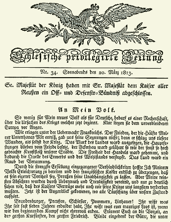 Die Idee einer Volkserhebung gegen Napoleon schwelte in Deutschland seit 1809. Doch erst mit der französischen Niederlage in Rußland erwuchs der anti-napoleonische Widerstand zu einem Massenphänomen. Als der Preußenkönig Friedrich Wilhelm III. am 17. März 1813 nach langem Zögern in seinem berühmten Aufruf »An mein Volk« verkündete, daß er mit Rußland ein Bündnis gegen Napoleon geschlossen habe, und zum Kampf aufrief, war dies die langersehnte Proklamation eines nationalen Bündnisses von Fürst und Volk.