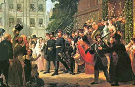 1. Nachbemerkung: Da die Rechteinhaber des Graef-Gemäldes Ferdinande von Schmettau aus unerfindlichen Gründen die Genehmigung zur Veröffentlichung im Internet verweigert haben, bildet Dikigoros hier als Ersatz das Graef-Gemälde Auszug der Landwehr ab, das ihm ohnehin viel besser zum Thema zu passen scheint. Anläßlich desselben schrieb nämlich der Halbjude Carl Heun (der sich mit dem Anti-Semiten Wilhelm Hauff das Pseudonym "H. Clauren" teilte :-) das Gedicht Gnadenfrei, dessen Anfangszeile zum geflügelten Wort wurde: "Der König rief, und alle, alle kamen", welches bei der 100-Jahrfeier der Befreiungskriege 1913 und ein Jahr später beim Ausbruch des Ersten Weltkriegs ausgiebig zitiert wurde.