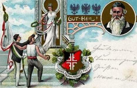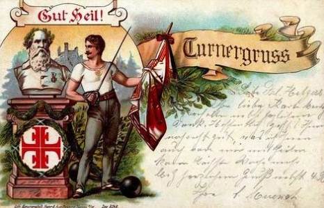 Zurück zum Ausgangspunkt. Was war seit je her die weltweit meist verbotene Sportart, da sie als "subversiv" und "staatsfeindlich" galt/gilt? Richtig: Das Turnen! Schon der "Turnvater" Jahn galt im 19. Jahrhundert als eine Art "Nazi", denn er stellte die Nationen über die dynastischen Herrscherhäuser. Allerdings seht Ihr ihn auf einschlägigen Abbildungen nicht nur am rechten, sondern auch am linken Bildrand.