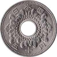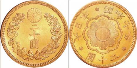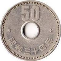 Auch dazu ein paar Erläuterungen: Auf der Vorderseite der Goldmünze steht - von oben nach unten - "20 [die Kanji für '2' und '10'] Yen". Auf der Rückseite steht - kreisförmig von rechts nach links - "Showa 7 Jahr [7. Regierungsjahr von Hirohito, also 1932] 20 Yen Dainippon [Großjapan]". Auf der Vorderseite der Blechmünze steht oben "50 [in westlichen Ziffern]" und unten - von links nach rechts - "Showa 34 [die Kanji für '3', '10' + '4'] Jahr" [34. Regierungsjahr Hirohitos, also 1959]. Auf der Rückseite steht oben - von links nach rechts - "Nihon-Koku [Japan-Land, d.h. Land der aufgehenden Sonne]" und unten - wieder von links nach rechts - "50 [die Kanji für '5' und '10'] Yen". |