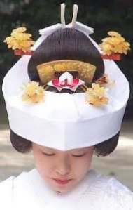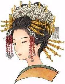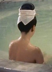 Links zwei schlechte Bilder - nicht nur, weil die Fotomontage mißlungen ist. (Dikigoros hat leider keine besseren gefunden.) Warum denn noch? Weil sie so gut wie nichts von der traditionellen Geisha-Frisur - kunstvoll hoch gesteckt und mit Blumen geschmückt - zeigen. Dies ist der einzige Dikigoros bekannte Film, in dem man sieht, daß es sich dabei um eine Perücke handelt, und wie die Geisha sie aufsetzt. |