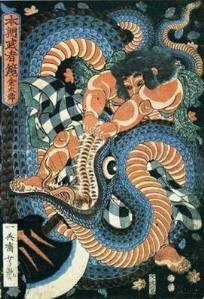 Das 1. Kanji hat den Leit-Radikal "Insekt" (alles was sticht und/oder beißt :-), auf den Dikigoros weiter unten bei "Kurotokage" noch ausführlicher zurück kommt; es bedeutet "Schlange". Das 2. Kanji setzt sich zusammen aus "Frau" (bzw. "weiblich") und "Prinz", bedeutet also "Prinzessin". "Schlangenprinzessin"? Tja, das klingt furchbar; aber in den fernöstlichen Kulturen sind Schlangen (und Drachen :-) nicht notwendiger Weise negativ besetzt (wenngleich der Held, der bei uns traditionell den Drachen besiegt, das in Japan eher mit der Schlange tut, wie auf dem Bild rechts :-) |