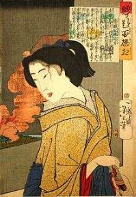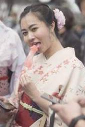 (Ursprünglich hatte Dikigoros "Zwei ganz schlechte Bilder" geschrieben; aber man sieht auf ihnen doch wenigstens, daß japanische Obi, anders als westliche Gürtel, nicht dazu dienen, die Taille zu betonen - etwa um Hüfte und/oder Busen besser zur Geltung zu bringen -, sondern im Gegenteil dazu, gleiche Körpermaße vorzutäuschen, z.B. 75-75-75. Nur ausgemachte Schlampen - wie die auf dem Bild unten - binden den Obi eng "auf Taille"!) |
