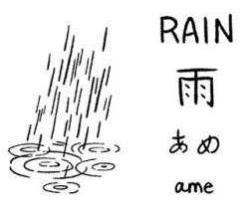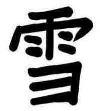 Was fällt auf? Zunächst einmal, daß das 1. Kanji immer schlampig gepinselt ist. Sauber geschrieben erkennt man unschwer Tropfen, die vom Himmel fallen, es bedeutet also "Niederschlag" im weiteren und "Regen" im engeren Sinne. (Das Kanji hat, wie so viele, mehrere Lesarten: Die japanische lautet "ame", die chinesische[n] "U" oder "YU" - auf letztere kommen wir unten zurück, bei "Sasameyuki".) Nun, diese Schlamperei kann man als "künstlerische Freiheit" durchgehen lassen, da dieses Kanji so häufig ist, daß es trotzdem jeder erkennt. |