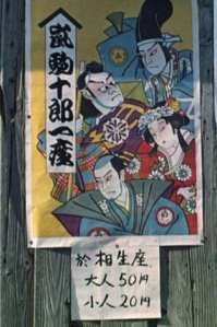Daß das, was da auf dem Kinoplakat abgebildet ist, nichts mit "Liebe" zu tun hat, bedarf keiner großen Erklärung. (Das Wort für Liebe - "ai" - hatten wir ja schon, besser gesagt ein Wort für Liebe, zu den anderen schreibt Dikigoros unten, bei "Tōjūrō-no koi", etwas mehr.) Doch auch hier geht es um ein Gefühl ["Jō" - 1. Kanji]. Welches? Die Deutschen nennen es "das Feuer der Leidenschaft"; aber im 2. Kanji brennen gleich zwei Feuer übereinander. (Dikigoros läßt die Frage dahin stehen, ob Japaner etwa doppelt soviel Leidenschaft empfinden wie andere Völker :-) Es folgt - in Hiragana - ein "no", das den Genitiv anzeigt, und dann ein Begriff aus drei Kanji. Ohne das erste wäre es einfach ein Platz, wo man etwas hinstellt oder festmacht. (Z.B. ein Pferd - aber das ist nur eine |