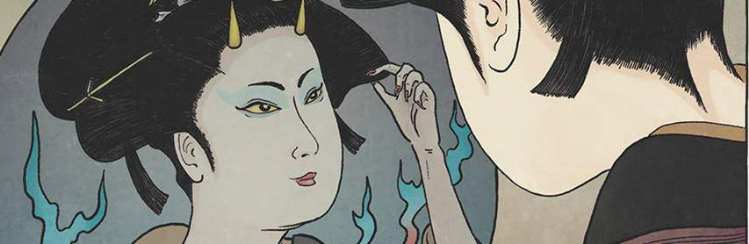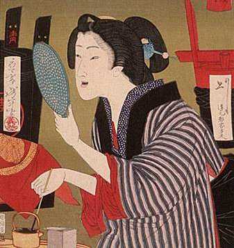 Aber hier will er erstmal auf etwas Anderes hinaus, nämlich die Bilder. Die links sind aus dem Film, das unten ist dagegen frei erfunden - von jemandem, der sich in der Vergangenheit wohl nicht mehr so genau auskennt: Im alten Japan war es üblich, daß Frauen ihre Augenbrauen entfernten ["Hikimayu"] und sich dafür zwei Flecken aus einer ocker-farbenen Paste auf die Stirn schmierten. (Dto, sich die Zähne schwarz zu lackieren ["Ohaguro"], aber darauf verzichtet der Film zum Glück :-) Erst 1870 wurde das im Zuge der Meiji-Reformen verboten - um vor den Gaijin nicht primitiv zu erscheinen!