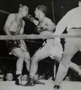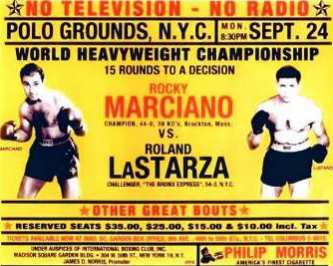 4Manche meinen, daß LaStarza - der bis dahin ungeschlagen war - sogar den Punktsieg verdient gehabt hätte, da Marciano an jenem Abend ungewöhnlich schwach geboxt habe. Dikigoros kann das nicht beurteilen, denn Aufnahmen von jenem Kampf scheint es nicht (mehr?) zu geben. Aber er kennt den - angeblichen - Grund: Marciano hatte im vorauf gegangenden Kampf einen gewissen