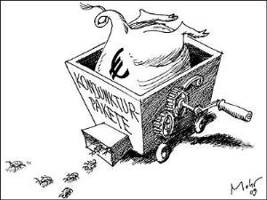 seit 2011 - sogar für den Import von Getreide, Speiseöl u.a. Grundnahrungsmitteln, die die marode chinesische Landwirtschaft selber nicht mehr in ausreichender Menge produzieren kann; was Dikigoros oben geschrieben hat, ist also insoweit überholt.] Ganz uneigennützig, versteht sich: Da werden z.B. den vor dem Bankrott stehenden südeuropäischen Nun könnten Cyniker meinen, so ein Staatsbankrott sei doch gar nicht so schlimm: Innenpolitisch können sich die Untertanen ja eh nicht dagegen wehren, und nach außen müsse man halt etwas abwarten, bis die Gläubiger die Rückstände abgeschrieben haben und wieder neue Kredite fließen; unterdessen würde sich die Wirtschaft gesund schrumpfen; man könne wieder auf Binnenhandel umsteigen, notfalls zunächst auf Tauschbasis, und dann halt mittels einer Währungsreform... Beispiele gibt es doch viele: Nicht nur Spanien, das wie gesehen mehrere Staatsbankrotte hatte und dennoch überlebt hat; auch andere Länder hatten Hyperinflationen und Geldentwertungen, Deutschland noch im 20. Jahrhundert sogar zwei; und im Grunde genommen war ja auch die Währungsumstellung von DM auf Teuro zu Beginn des 21. Jahrhunderts nichts weiter als eine Geldentwertung um 50%, denn ein TE hat heute nicht mehr, sondern eher etwas weniger Kaufkraft als zuvor eine DM. Also, was solls, wenn ein paar Nullen vom Papiergeld gestrichen werden, denen eh keine realen Werte gegenüber stehen, sondern nur eine illusorische Fantasiegeldblase? - Eine ganze Menge, liebe Leser, eine ganze Menge. So ein Binnenhandel setzt voraus, daß eine gesunde Volkswirtschaft vorhanden ist. (Aber dann gäbe es gar keinen Staatsbankrott :-) Und selbst dann ist "Autarkie" ein Ding der Unmöglichkeit; selbst die bösen Nazis, die mit großen Anstrengungen versuchten, eine solche herzustellen (und damit die Angelsachsen so verärgerten, daß die den Zweiten Weltkrieg vom Zaun brachen), schafften das nicht. Aber unsere Volkswirtschaft ist, um mit Billy Wilder zu sprechen, krank wie Hund. Noch einmal: Die BRDDR, ja die ganze EU produziert heute nicht mal mehr genügend Grundnahrungsmittel, um ihre Bevölkerung auch nur von Kartoffeln und trocken Brot zu ernähren (geschweige denn ihre Tiere von Steckrüben oder Mais - die würden noch früher verhungern als die Menschen)! Es käme zu Hungersnöten und Aufständen - denn die Menschen heute sind nicht mehr so geduldig wie noch vor 100, 200 Jahren, als Millionen stillschweigend verhungerten. (Es gäbe auch nicht mehr genug Militär und Polizei, um solche Aufstände nieder zu schlagen.) Und neue Kredite von außen? Ja, die kann man bekommen, solange es überhaupt noch Kredit gibt. Wenn aber das ganze Weltfinanzsystem zusammen bricht, dann geht auch das nicht mehr - und seit Herbst 2008 ist das de facto der Fall; da helfen auch staatliche "Konjunktur-Pakete", Bürgschaften und Garantien auf Dauer nichts, egal wie hoch und wie weit reichend; denn die sind ja im Grunde nichts anderes als es früher der Griff zur Notenpresse war, d.h. ungedeckte Wechsel auf die Zukunft und ein ungeheures Anheizen der Inflation. Eine vor die Wand gefahrene (Volks- oder Welt-)Wirtschaft kann man nicht so einfach wieder flott machen, indem man Nullen auf Papier schreibt.