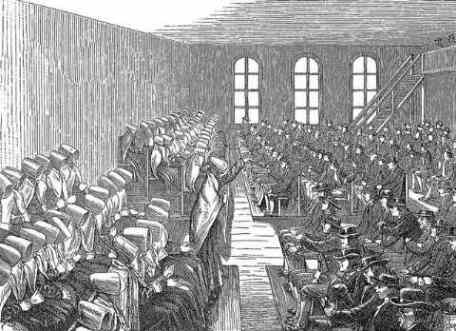 Nun wurde es aber höchste Zeit, dagegen zu halten. Ein britischer Professor hat The Pilgrim's Progress einmal als "exzellente puritanische Propaganda und feinen Abenteuerroman zugleich" bezeichnet, aber darauf war das Buch ursprünglich nicht angelegt. Die erste Fassung, angeblich 1675 geschrieben, aber erst 1678 erschienen, ist ein ganz harmloses, ja fast nichts sagendes Büchlein, das wohl schwerlich zum Bestseller Nr. 2 in der protestantischen Welt geworden wäre. Ja in der ganzen protestantischen Welt, denn die Endfassung sollte in alle wichtigen Sprachen übersetzt und in aller Welt gekauft und gelesen werden. (Nein, liebe Leser, Dikigoros hat sich hier nicht die biestige Anmerkung "im Gegensatz zur Bibel" entgehen lassen; damals wurde - im Gegensatz zu heute - auch der Bestseller Nr. 1 noch gelesen, und zwar intensiv.) Unter dem Eindruck der den Puritanern keineswegs günstigen Entwicklung in Nordamerika schrieb Bunyan die zweite und letzte Fassung seines Werkes so, daß er bei der Veröffentlichung 1684 als Apologie der Puritaner verstanden werden konnte - und sollte. Fortan setzte sich in den Hinterköpfen nicht nur der Briten fest, daß die nordamerikanischen Kolonien Kinder Englands seien. Bereits 1686 wurden New York, New Jersey und Pennsylvania zum "Dominion New England" zusammen geschlossen (später sollten noch Connecticut, Rhode Island, Massachusetts, Maryland und Maine hinzu kommen). Ein dagegen gerichteter Aufstand der Siedler unter dem Deutschen Jacob Leisler (kein Quäker und kein Mennonit) brach nach drei Jahren zusammen - Leisler und seine engsten Mitarbeiter wurden 1691 als "Kriegsverbrecher" gehenkt; William Penn wurde ein Jahr später enteignet und ins Exil verbannt. Die Würfel waren gefallen, die Puritaner hatten gesiegt und feierten fröhliche Urstände: In Salem wurden Nicht-Puritanerinnen als "Hexen" verbrannt; im - bis dahin überwiegend katholischen - Maryland die katholische Messe verboten. Boston war inzwischen eine Großstadt von fast 7.000 Einwohnern, New York und Philadelphia zählten immerhin gut halb soviel, und es soll noch ein halbes Dutzend weiterer Städte mit über tausend Einwohnern gegeben haben! Ja, aber was für welche - Ihr dürft Euch das Leben in ihnen allen ebenso freudlos vorstellen wie den Gottesdienst, den das Bild unten zeigt: Selbst Orgelspiel und Singen waren in der Kirche verboten, und Lachen und Tanzen außerhalb sowieso.