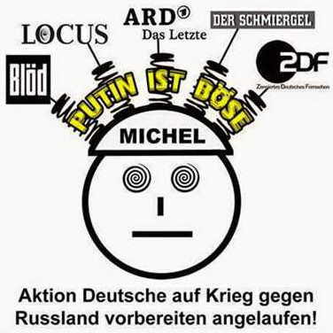 Die deutsche Propaganda erzählt den Menschen, dass X böse ist. Das macht sie mit Milliardenaufwand und über Jahre. Dann lässt sie eine Umfrage erstellen, deren Fragen gewiss nicht dumm formuliert sind. Diese Umfrage ergibt etwas, das sich »journalistisch« als »X ist böse« interpretieren lässt. Und dann speist die Propaganda als neue Erkenntnis in den Propagandakreislauf ein, dass die Mehrheit der Deutschen meint, dass X böse ist. Diese »neue« Nachricht aber appelliert an jenen Teil der Menschen, die Teil der Mehrheit sein wollen, selbst wenn es sie zu Lügnern und Schafen auf dem Weg ins Schlachthaus macht.