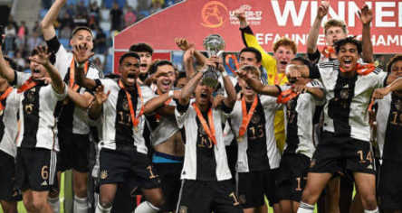 Nachtrag: Etwas gibt Dikigoros allerdings zu denken, nämlich ein Blick auf die Mannschaft, die anno 2023 die U-17-Weltmeisterschaft der Balltreter gewann, und die ein Bekannter von ihm (der ihm das Bild zur Verfügung gestellt hat) despektierlich als "eine Horde Halbaffen" bezeichnete. Das ist nicht nur mathematisch unzutreffend (zu den korrekten Zahlen s.o. - 50% seiner Gene hat der Mensch auch mit der Maus gemeinsam, aber Ihr würdet doch niemanden als "Halbmaus" bezeichnen - oder? Außer vielleicht Kevin Keegan :-), sondern übersieht auch - obwohl es eigentlich kaum zu übersehen ist -, daß der spielentscheidende junge Mann - er glänzte als "Elfmeterkiller" - sehr helle Haut und rotblondes Haar hatte. Und beide Ersatztorhüter - hier leider nicht mit im Bild - hatten ebenfalls die aus DFB-Sicht falsche Hautfarbe. Daran muß noch gearbeitet werden; denn die Zukunft des "deutschen" Fußballs - und ganz "Deutschlands" - sieht ja nach den Vorstellungen seiner derzeit herrschenden Politiker:innenkaste so aus: