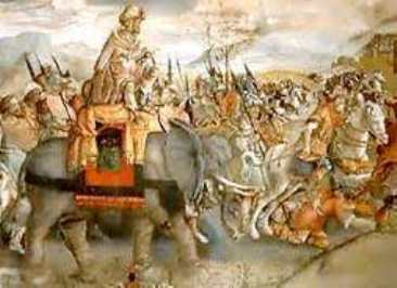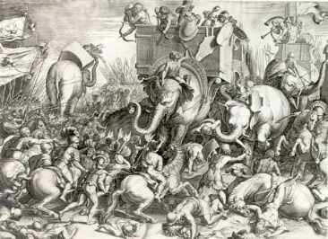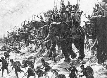 Nein, es gab noch nicht mal Flugzeuge oder Panzer - das höchste der Gefühle waren Elefanten, und zwar nicht solche Ungetüme, wie sie sich fantasiebegabte Künstler späterer Jahrtausende vorstellten, sondern solche, die nicht viel größer waren als Pferde; sie gehörten einer heute ausgestorbenen Rasse an, die in Nordafrika heimisch war; das Gemälde oben rechts dürfte die Größenverhältnisse in etwa richtig darstellen. Ansonsten wurde zu Fuß marschiert, und auch das nicht besonders weit: Das Herrschaftsgebiet der Römer reichte nicht über die Ufer des Mittelmeeres hinaus (denn sie hatten bis 262 v.C. noch keine Flotte - ein weiterer Grund, weshalb alle Vergleiche mit den Angelsachsen des 19. und 20. Jahrhunderts hinken), und im Norden nicht über den Po. Schlachten wurden noch auf ganz altertümliche Art und Weise entschieden, im Kampf Mann gegen Mann, bisweilen kämpften sogar nur die Anführer gegeneinander. Das glaubt Ihr nicht, liebe Leser, die Ihr Euch nicht vorstellen könnt, daß etwa Rosenfeld und Weinstein gegen Adi und Benni mit dem Säbel in der Hand gefochten hätten? Und doch wären so viele Menschenleben gerettet worden! Noch 223 v.C. besiegte der römische Consul Claudius Marcellus den Gallier-Häuptling Virdumarix im Zweikampf und rettete so die Po-Grenze (da lag der Ausbruch des so genannten "Ersten Punischen Krieges" schon 41 Jahre zurück). Zwei Jahre später rufen die karthagischen Söldner in Spanien Hannibal zum Heerführer aus, und die Regierung in Karthago muß diese "Wahl" zähneknirschend bestätigen. Wieso "zähneknirschend"?