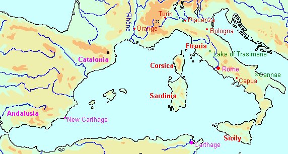 Aber bisweilen kann man ja Glück im Unglück haben: Karthago besaß einige tüchtige Felherren - vor allem aus der Familie, zu der auch Hannibal zählte) -, die sich alsbald auf die Ledersocken machten, um mit ihren Freikorps andere, schönere und reichere Gebiete zu erobern als den italienischen Stiefel: sie suchten und fanden sie auf der iberischen Halbinsel, wo sie Neu-Karthago (das heutige Cartagena) gründeten und sich mehr oder weniger von Alt-Karthago im heutigen Tunesien unabhängig machten. Als natürliche Grenze einigten sie sich mit den Römern auf - nein, nicht auf die Pyrenäen, die waren doch ganz leicht zu umgehen, an der heutigen Costa Brava entlang, sondern auf den Iberus (den heutigen Ebro). Nicht, daß sie dabei besonders zartfühlend vorgegangen wären: Sie unterwarfen die keltischen "Eingeborenen" ebenso brutal und rücksichtslos wie das die Römer in Italien taten (genauer gesagt im heutigen "Norditalien", das sie damals selber noch "Gallia cisalpina [Gallien diesseits der Alpen] nannten); als sich das bis Sagunt herum gesprochen hatte - das rund 250 km südwestlich des Ebro, also eindeutig innerhalb der karthagischen "Interessen-Sfäre" lag - stellten sich dessen Einwohner ausdrücklich unter römischen Schutz; die Römer gaben eine Garantieerklärung ab, und als Hitler Danzig besetze, begann der Zweite Weltkrieg, pardon, da ist Dikigoros eine Zeile aus einer anderen "Reise durch die Vergangenheit" in die Tastatur gerutscht; richtig muß es natürlich heißen: Als Hannibal (dessen Vater gefallen und dessen Schwager ermordet worden war) kurz nach seiner Machtergreifung (Dikigoros benutzt dieses Wort bewußt, weil er zwar an die 90% der Wählerstimmen im Heer bekommen hatte, aber diese "Wahl" natürlich nicht "demokratisch" war, denn was "demokratisch" ist, bestimmen die Römer als die späteren Sieger :-) Sagunt besetzte, begann der Zweite Punische Krieg - jetzt liegen wir zeitlich und sachlich richtig.