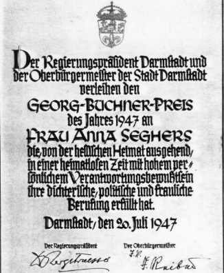 1947 kehrten die Radványis nach Europa zurück (außer Lászlo, der vorerst in Mexiko blieb), zunächst nach Frankreich (wo die Kinder wohlweislich auf Dauer blieben), dann nach Ost-Berlin, wo "Anna" sogleich Karriere machte, als Mitglied des "Deutschen Schriftsteller-Kongresses" und des "Weltfriedens-Kongresses" und des "Weltfriedensrats". (Ihr Mann sollte erst fünf Jahre später nachkommen.) "Anna" schrieb schlecht, sie redete noch schlechter, aber das hinderte nicht, daß die bekennende Kommunistin gleich 1947 den (westdeutschen) Georg-Büchner-Preis verliehen bekam - zwanzig Jahre, nachdem er an den bekennenden Faschisten Kasimir Edschmid verliehen worden war. (Der hatte ihn freilich nicht am 20. Juli bekommen, denn das war damals noch kein Ersatz-Nationalfeiertag.) In einer Seghers-Biografie hat Dikigoros gelesen, sie hätte ihn für "Das 7. Kreuz" bekommen - das wäre schon schlimm genug, denn das Buch taugte wie gesagt nicht viel (aber wie böse Zungen behaupten taugten auch die Werke Büchners nicht viel mehr :-). Aber das stimmt nicht. In der Begründung heißt es vielmehr wörtlich, der Preis gehe "an Frau Anna Seghers die, von der hessischen Heimat ausgehend, in einer heimatlosen Zeit mit hohem persönlichem Verantwortungsbewußtsein ihre dichterische, politische und frauliche Berufung erfüllt hat."