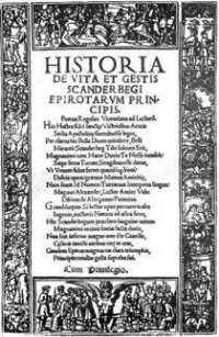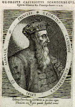 Welche Nation hat nun das Recht, Alexander für sich in Anspruch zu nehmen? Darüber wird erbittert gestritten, wie Ihr - so Ihr über die notwendigen Sprachkenntnisse verfügt - auch im Internet verfolgen könnt, denn die Völker des Balkans sind - wie Alexander selber - große Streiter vor dem Herrn, und jede Partei kann gewichtige Gründe für ihre Ansicht aufführen. Auf seiner bekanntesten Darstellung (die aber nicht zeitgenössisch ist, sondern wahrscheinlich aus dem frühen 17. Jahrhundert stammt, obwohl "1444" drauf steht, und deshalb weder für sein Aussehen noch für seine Nationalität echte Aussagekraft hat) bleibt diese Frage offen, da werden gleich alle in Frage kommenden Länder genannt: Epirus, Albanien, Thrakien, Epirus und Makedonien.