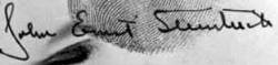 Auf der Ausgangsseite dieser "Reise durch die Vergangenheit" hat Euch Dikigoros einen Aufsatz verlinkt, in dem von einem "doppelten Ernst" die Rede ist und dazu angemerkt, daß man eigentlich von einem "dreifachen Ernst" sprechen müßte. Aber selbst das ist noch nicht die ganze Wahrheit; denn zur "Generation 1902" gehörte - neben Ernst von Salomon, Ernst Jünger und Ernst Glaeser - streng genommen noch ein vierter Ernst, wenngleich Ihr den auf fast allen englischsprachigen Webseiten vergeblich suchen werdet. Aber schaut Euch oben seine Unterschrift an, dann werdet Ihr feststellen, daß auch John Steinbeck diesen Namen trug - wenngleich er ihn als Angehöriger jener Generation von Deutsch-Amerikanern, die Opfer der Pogrome von 1917 waren, bis kurz vor seinem Tode nicht mal als "middle initial" zu gebrauchen wagte. (Dikigoros darf doch hier das russische Wort für Judenverfolgungen gebrauchen, nicht wahr? Ein Großteil der Betroffenen waren jüdischer Abstammung - auch Steinbeck, denn sein Vater, Johann Ernst Steinbeck sen., war ein aus Preußen eingewanderter Jude; allerdings war seine Mutter eine katholische Irin, so daß er nach jüdisch-orthodoxem Recht - das nur die matrilineare Abstammung anerkennt, weil es davon ausgeht, daß "Schicksen" ihre jüdischen Ehemänner grundsätzlich mit Nichtjuden betrügen - ein "Goj" war.) In den USA werdet Ihr bis heute nur frühere Signaturen von ihm finden, in denen "Ernst" fehlt. (Gewiß, die sehen ja auch viel besser aus als die späteren - im Alter baut man halt ab; das werdet auch Ihr, liebe jüngere Leser, irgendwann einmal feststellen -, es gibt also eine prima AusredeBegründung dafür.)