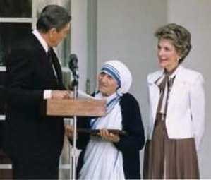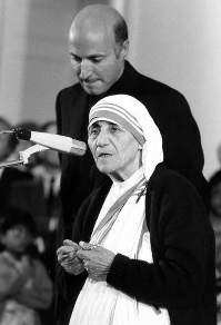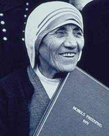 *Teresas **Der mit 2,5 Mio Rp. dotierte, auf Englisch als "Jawaharlal Nehru Award" bezeichnete Preis wurde erstmals 1965 an den barmesischen UNO-Generalsekretär U Thant verliehen. Mutter Teresa war die 5. Preisträgerin. In den folgenden Jahren wurde er - ähnlich wie der Friedens-Nobelpreis - weitgehend entwertet, da er an eine Reihe übler Politverbrecher u.a. Krimineller verliehen wurde wie Kaunda (1970), Tito (1971), Nyerere (1973), Mandela (1979), Palme (1985), Arafat (1988) und sogar an den Massenmörder Mugabe (1989) - was freilich Helmut Kohl nicht daran hinderte, den Preis im Folgejahr ebenfalls anzunehmen, ohne rot zu werden, ebenso wenig seine Nachfolgerin anno 2011. [Es fehlen eigentlich nur Mao Tse-tung - dem der Preis 1966 von Martin Luther King "weg geschnappt" wurde - und Pol Pot. Mit einer Verleihung an Evo Morales in nächster Zeit ist zu rechnen, nachdem 2006 bereits dessen Freund und Förderer Lula da Silva ausgezeichnet wurde. Da der Preis gerne posthum verliehen wird, haben wohl auch Fidel Castro, Norodom Sihanouk und Hugo Chávez noch Chancen.] ***Bezeichnend für die Art und Güte jenes Werkes ist, daß der Autor nicht mal seinen eigenen Namen richtig schreiben kann. ****Die Kontakte mit Hoxha werden von Teresas Anhängern bestritten. Richtig sei vielmehr, daß sie zu dessen Lebzeiten Einreiseverbot nach Albanien gehabt habe. *****Hitchens bezog sich ganz konkret auf Äußerungen Mutter Teresas in Irland, mit denen sie sich freilich dort kaum Gehör verschaffen konnte. Eire ist heute der Staat mit der niedrigsten Geburtenrate in Europa; die Iren stehen zum ersten Mal in ihrer Geschichte - und ganz ohne Zutun der Engländer - vor dem Aussterben. Gewiß ein schweres Verbrechen, dem entgegen wirken zu wollen! Wes Geistes Kind Hitchens ist - ein fanatischer Kirchenhasser im allgemeinen und ein Todfeind der katholischen Kirche im besonderen -, offenbarte er einmal mehr im April 2010, als er von der britischen Regierung verlangte, Papst Benedikt XVI wegen "Verbrechens gegen die Menschlichkeit" verhaften zu lassen. Das "Verbrechen" habe darin bestanden, den Mißbrauch von Kindern durch schwule Erzieher an katholischen Einrichtungen "systematisch verheimlicht" zu haben. (Diese Mißbrauchsfälle - die durchaus nicht nur an katholischen Einrichtungen vorkamen - hatten durch die Bank mehrere Jahrzehnte vor Benedikts Amtsantritt und ohne seine Kenntnis statt gefunden. Hitchens meinte jedoch, daß Benedikt als Repräsentant der "Institution Kirche" persönlich bestraft werden müsse.) Hitchens zog noch viele andere mehr oder weniger populäre Zeitgenossen ungestraft in den Dreck, bis er es eines Tages zu weit trieb: Im November 2011 reiste er nach Australien und hielt in Sydney eine Rede, in der er die marxistische Politik des kenyanischen Krypto-Muslims Barack Hussein Obama zu kritisieren wagte. Als er im Dezember 2011 in die USA zurückkehrte, wurde er von dessen Schergen in ein Krankenhaus in Houson/Texas eingeliefert, wo er plötzlich und unerwartet verstarb. (Über die Todesursache wurden widersprüchliche Angaben gemacht, von "Lungenentzündung" bis "Krebs" - aber niemand, dem sein Leben lieb ist, fragt da näher nach :-) ******Wieder jemand, der seinen eigenen Namen nicht richtig schreiben kann; das Buch ist - trotz einiger interessanter Fakten - unsachlich bis zur Bösartigkeit. So wird Teresa u.a. jede Schüssel Reis vorgerechnet, die sie nicht an die Armen verteilt habe und jeder Todkranke, den sie nicht bei sich aufgenommen habe - wobei letztere z.T. lediglich von agents provocateurs des Autors vorgetäuscht wurden.