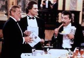 "Kismet," meint Charly ganz gelassen. "Was solls, Alter, Du hast Deine Pappe verloren, und ich meine Gummis!" Also müssen sie notgedrungen die "Rote Mütze" retten: Udo - der sich inzwischen einen neuen Anzug zugelegt und seinen Job als Deutsch-Lehrer gekündigt hat - holt sich zwar beim miesepetrigen Kreditsachbearbeiter [Heinrich Schafmeister] einer Wessi-Bank (Ossi-Banken gibts ja nicht :-) eine Absage ("Was haben Sie denn für Sicherheiten? Was haben Sie gelernt?" - "Ich bin gelernter DDR-Bürger!"); aber irgendwie schafft er es, bei einem Büffet in der Dresdner Staatsoper dessen Chef, Bankdirektor v. Hohenstein [ Dietmar Schönherr] kennen zu lernen und mit einer Reihe von Goethe-Zitaten zu beeindrucken, woraufhin ihm der prompt einen Millionen-Kredit der Wirtschaftsbank zusagt - vorausgesetzt, er kann entsprechende Aufträge nachweisen.