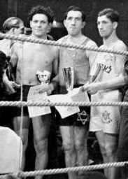viel zu früh gestorben bei einem idiotischen Flugzeugunfall 1969. In einem seiner weniger wichtigen Kämpfe - Jahre bevor er Weltmeister wurde - schlug er 1949 einen gewissen Harry Haft schwer k.o. und beendete damit dessen Karriere. 60 Jahre später erschien in Göttingen ein Buch mit dem Titel "Eines Tages werde ich alles erzählen", das ein gewisser Alan S. Haft geschrieben haben wollte. (Tatsächlich handelte es sich um die Übersetzung eines von John Radzilowski und Mike Silver anno 2006 geschriebenen Werkes.) Es sei die Lebensgeschichte seines Vaters Moses Friedler, der identisch sei mit jenem Harry Haft, der von den bösen Nazis verfolgt wurde, im Konzentrationslager Kämpfe um Leben und Tod austragen mußte und schließlich in die USA auswanderte. Gegen Marciano habe er nur verloren, weil die Mafia ihm zuvor gedroht habe, ihn andernfalls umzubringen. Das war selbstredend ein gefundenes Fressen für gewisse Lobbyistenkreise, die ihn sogleich in die "National Jewish Sports Hall of Fame" aufnahmen - wobei man sich fragt, warum ihnen das erst anno 2007 einfiel, denn daß Harry Haft richtig Hertzko (oder mit Kosenamen "Herschel") Haft hieß, war längst bekannt und nichts Ungewöhnliches. Offenbar verdankte er diese "sportliche" Ehrung nicht seinen Meriten als Boxer, sondern seiner erst jetzt entdeckten - angeblichen - politischen Vergangenheit. Angeblich, denn die Wahrscheinlichkeit, daß Harry Haft identisch war mit jenem KZ-Häftling Moses Friedler, liegt nach Dikigoros' vorsichtiger Schätzung nur knapp über null. Aber entscheidet selbst, liebe Leser: Links ein Foto von Moses Friedler - 1. von links, oben ohne - nach dem Gewinn einer obskuren "jüdischen Meisterschaft" in München 1946; daneben ein Foto von Harry Haft vor dem Kampf gegen Marciano 1949, das auch für das vorgenannte Buch Verwendung fand. (Die Ähnlichkeit zwischen dem 2. und dem 3. Bild ist ja wirklich verblüffend; aber glaubt Ihr wirklich, daß der Typ darauf identisch ist mit dem auf dem 1. Bild? Dann solltet Ihr Euch vielleicht mal eine neue Brille anschaffen :-)