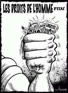 so ähnlich wie mit der Demokratie in der russischen Karikatur: Wer sagt denn, daß die "Menschenrechte" den Menschen irgendwelche Rechte - z.B. "liberté" [Freiheit] gewähren? Umgekehrt wird ein Schuh draus: Sie geben den "Staatsmännern" das Recht, ihre Untertanen mit eiserner Faust auszerquetschen zu unterdrücken und ihnen alle Freiheit[en] zu nehmen!