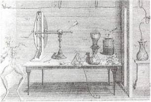 Figura 1. Grabado de la obra: "De viribus... de Galvani". Una rana "preparada en la forma usual", sometida al contacto de un bisturí, mientras salta una chispa [1].