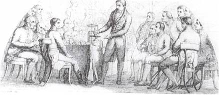 Figura 9. Volta presenta a Napoleón su pila y otros experimentos eléctricos.