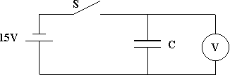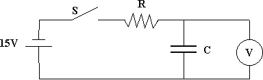 Desligue o circuito (abrindo a chave S) e tome 19 medidas de tempo (t) por tensão do capacitor (Vc) enquanto o capacitor descarrega sua tensão na resistência interna (Rv) do voltímetro;
