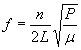 Equação 1. f é a frequência da corda, n é o número de ventres, L é o comprimento da corda (entre as duas extremidades fixas), P é a força tensora na corda e m é a densidade linear da corda [massa (m) / comprimento total da corda (l)]