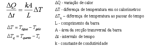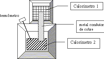 - Obter a capacidade térmica (C) do calorímetro 2; - Medir as dimensões do condutor de cobre; - Colocar uma massa (282,5g) de água aquecida ( oC) no calorímetro 2; - Colocar uma massa ( g) de gelo ( oC) no calorímetro 1; - Deixar apenas o metal condutor como ligação entre os dois calorímetros; - Calcular a variação de temperatura dentro do calorímetro 2 a cada 5 min. |