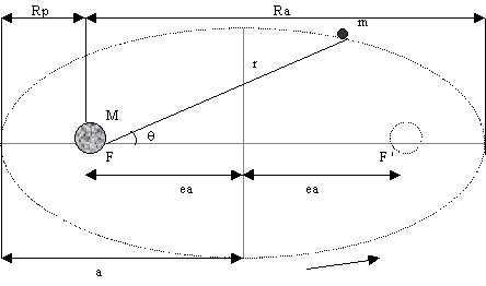 A órbita na Figura é descrita ao darmos o seu semi-eixo maior a e a sua excentricidade e, esta última definida de tal maneira que ea é a distância do centro da elipse até qualquer um dos focos F ou F'. Uma excentricidade zero corresponde a um círculo, onde os dois focos coincidem no seu centro. A excentricidade das órbitas planetárias não é muito grande, parecem circulares. A excentricidade da órbita da terra é apenas 0,0167.