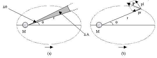 A figura acima mostra o momento linear p do planeta, juntamente com suas componentes. O módulo do momento angular L do planeta em relação ao Sol é dado pelo produto de r e a componente de p perpendicular a r, ou