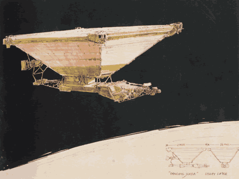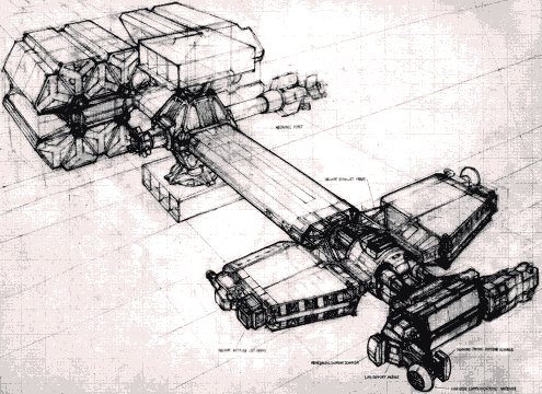 When it was decided that the earthship would tow a large platform containing some industrial complex, a problem was created. it was necessary to explain how the ship could tow an object without interfering with its own exhaust. One of the first versions of this platform featured a double bank of cargo containers providing a channel for the expulsion of engine exhaust.