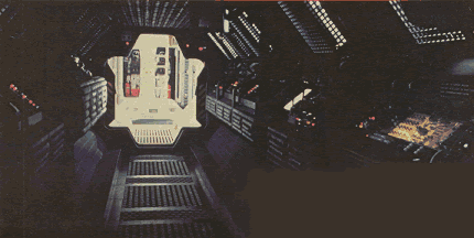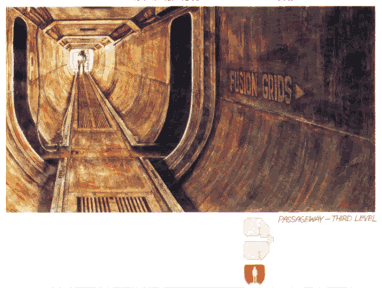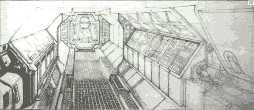 Pencil. An early design for a long, wide passageway to run along the top of the Bison-type earthship between the cargo modules. Not used in Alien.