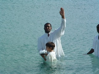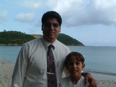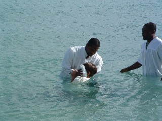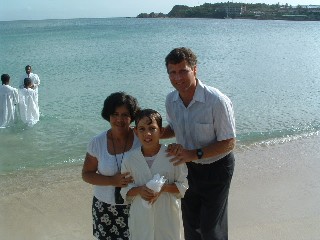 | BRETT'S BAPTISM Brett was baptized into the Shiloh Spanish Seventh-day Adventist Church of St. Thomas, US Virgin Islands, at Lindbergh Bay, St. Thomas, on July 1, 2003. Brett was baptized by Pastor Trent Berg, youth pastor at his school, but he studied with Pastor Carlos Molina (at bottom). |