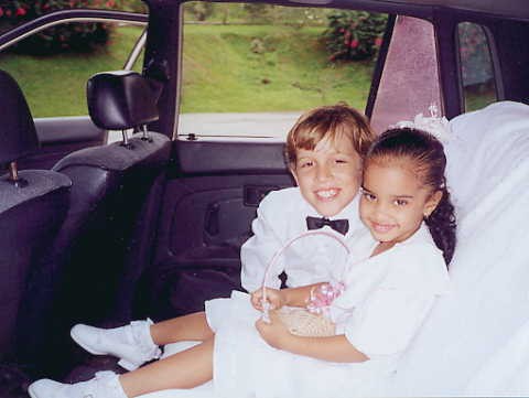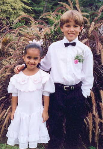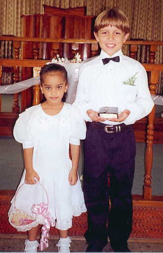 "Bible Boy" Brett with "Flower Girl" Macy Mahabir at a wedding on 26 August 2001