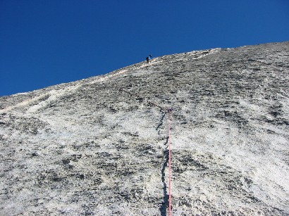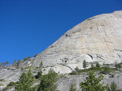 | Snake Dike follows the low-angle left skyline of the southwest face of Half Dome. |