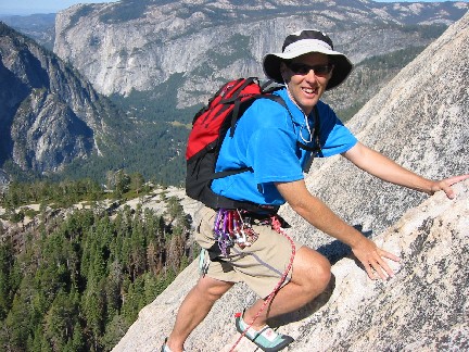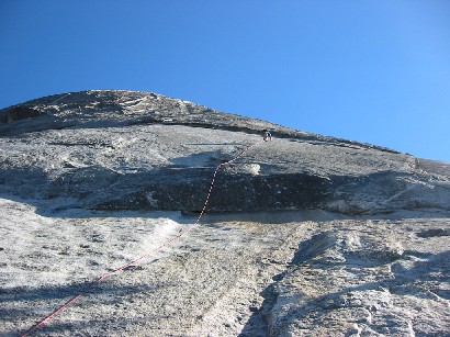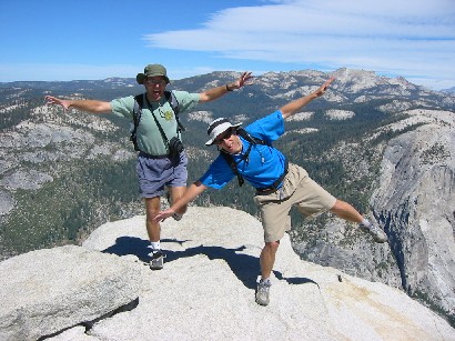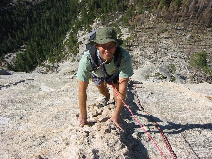| FLOYD ROCK CLIMBING WITH A FRIEND ON HALF DOME On September 12, 2004, I climbed SNAKE DIKE III 5.7, a long and moderate climb in Yosemite Valley, CA, with Mark Spencer. I first climbed this route 22 years earlier with Mark Spencer, Bill Baker and Earl Tresenriter, when it was my first climb ever. On these occasion we simulclimbed nearly the entire route, with Mark leading and me following. For more details on these climbs, click here. |
