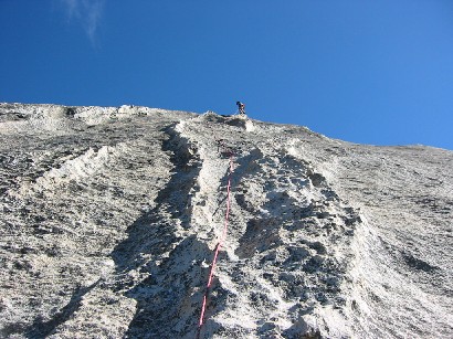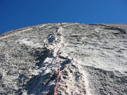 | Mark leading the 1st pitch (5.7) without placing protection.. |