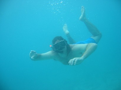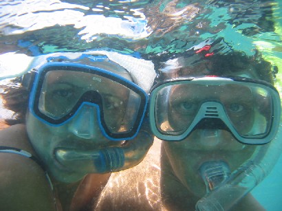| Brett goofs off while Marta keeps an eye out for sharks at Haulover Bay, St. John. |