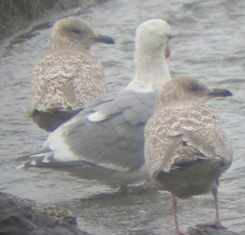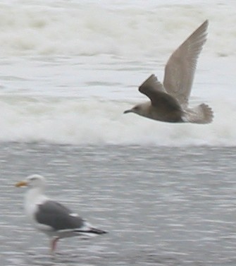 | I initially found this gull among perhaps 25 gulls on a small beach at Carmet (photo 1 above). About an hour later I was astonished to see it again among perhaps 1000 gulls at the mouth of the Russian River, about 6 miles to the north (photo 2 below). Note the relatively crisp and coarsely marked juvenal plumage, relatively dainty bill (much smaller than the bill of a Western Gull below), and rounded head. This bird is not deficient in melanin; it is neither pale nor strongly bleached. |