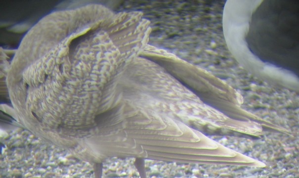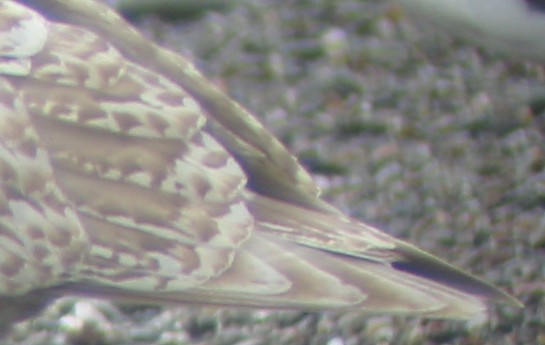 | The tertials are speckled along the margins and tips, but appear to have broad dark centers, which is typical of a Thayer's Gull, and is perhaps the strongest argument against this bird being a "pure" Kumlien's Gull, but some dark Kumlien's Gulls have similar markings (e.g., Figs. 35A.9 and 35A.12 of Howell and Dunn's Gulls of the Americas, 2006). The slightly worn primaries are paler than the tertials, with a pale brown wash and fairly broad white tips to the outermost primaries. Thayer's Gull typically has darker primaries with narrower pale tips, and the primaries are typically darker than the tertials. Primary 10 can barely be seen just behind primary 9 in the photo above; they appear to be about the same length (primary 10 is often longer in Thayer's). Primaries 1-9 are visible in the photo below. There is a hint of a dark subapical spot on primaries 4-8; quite possibly all the outer primaries had a pronounced subapical spot a month ago. The pale brown wash near the wingtips is likely to fade to white within the next month, producing a "white-winged" gull. Dark stippling is visible on primaries 1-6 and on the white tips and edges of the exposed secondaries. Dark internal markings on the flight feathers are more typical of Kumlien's Gull than Thayer's Gull. In Thayer's Gull the outer webs of the primaries are typically darker than the inner webs, producing a two-toned "venetian blind" effect (shared by some Kumlien's Gulls), but in this gull the brown is distributed evenly on both webs, a pattern more typical of Kumlien's Gull. |