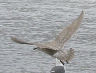 | The tail has a fairly solid dark area in the inner rectrices but white occurs at the tips and margins of all rectrices, especially the outer ones. Some dark spots are visible within the dark tail band, even in the inner rectrices. Thayer's Gull typically has a more uniformly dark tail. Spotting is more typical of Kumlien's Gull. |