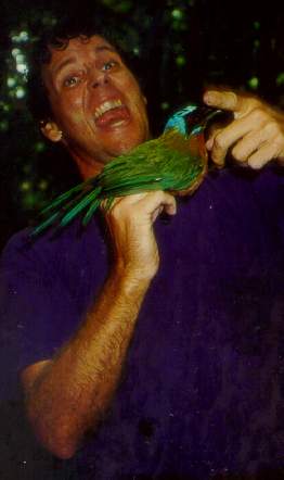 | Getting chomped by a Blue-crowned Motmot (Momotus momota) at Gilpin Trace, Tobago, 28 June 1999. Photo by Tony Trimm. |