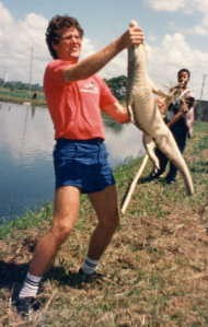 | Wrestling with a Spectacled Caiman (Caiman crocodylus) at Trincity, Trinidad, 4 May 1997. Photo by Tony Trimm. |