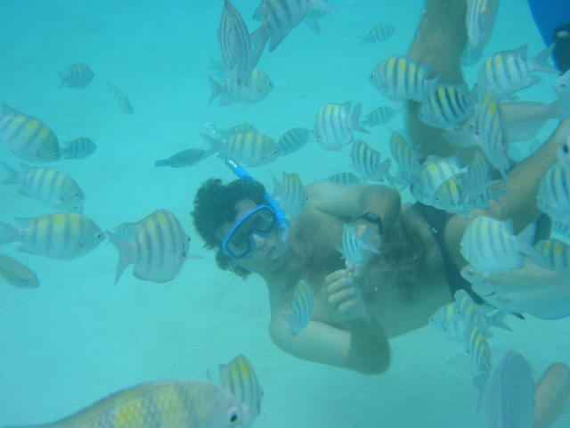 | Feeding Sargeant Majors (Abudefduf saxatilis) at Coki Beach, St. Thomas, U. S. Virgin Islands, 2 March 2003. Photo by Brett Hayes. |