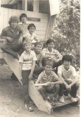 | With campers under my supervision in front of the covered wagon Fremont at Camp Wawona, Yosemite National Park, where I spent the summer of 1992. |